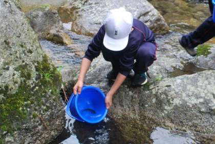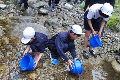 稚鮎を放流した後、「大きくなって帰って来てね」と手を振りながら川を泳いでいく様子を見守る子がいました。やさしい気持ちに触れ、心が温かくなりました。