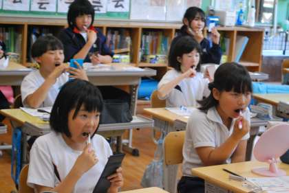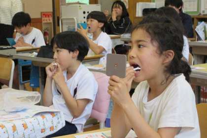 学習内容を収録したDVD教材を使ってクイズに答えたり、歯みがきの実習をしたりして歯と口の健康について楽しく学習しました。