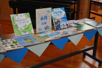 昨日、この地域も梅雨入りしました。それを受けて、本の森に雨に関する本を紹介するコーナーを設けました。休み時間などに本を手にする子がたくさん見られました。