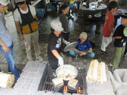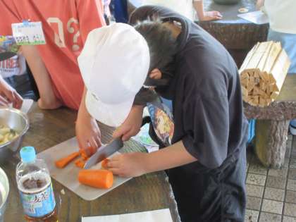 入所式が済むと、昼ご飯のカレー作りが始まりました。ニンジンを上手に切ったり、カレーの具に火が均等に通るようにかき混ぜたりして、みんなで協力して活動していました。