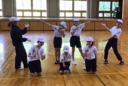 全校児童が3つのグループに分かれて練習した成果を発表する予定でしたが、今日は1つのグループの欠席者が多かったので、2つのグループがダンスの発表をしました。