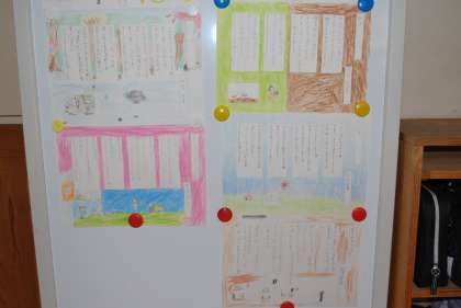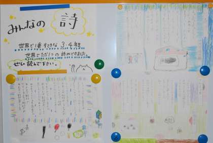 3,4年生の教室前に、楽しい「詩」が掲示してありました。国語の学習で書いたものです。担任の先生のアドバイスを聞きながら、子どもたちが自分の思いを詩にしました。
