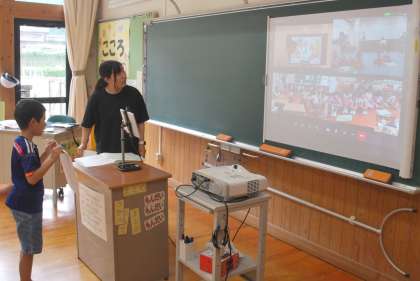 今回のあすけ集合学習はオンライン授業でした。他校の子たちに自分の考えを伝えたり、他校の子たちの発表を聞いて自分の学びを深めたりしていました。