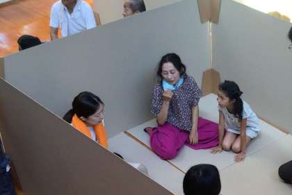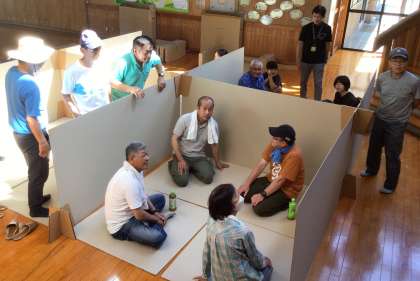 多目的ホールでは、段ボールの間仕切りや段ボールベッドの組み立て体験をしたり、市の職員の方に簡易トイレの作り方を教えてもらったりしていました。