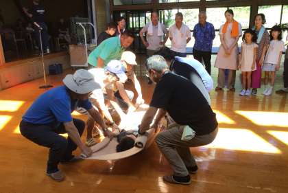 毛布を使って応急の担架も作りました。防災に関する様々な体験を通して、子どもたちは地域の方たちと一緒に防災に関する知識を深めることができました。