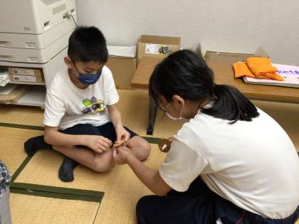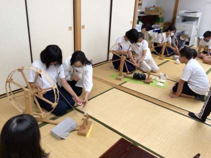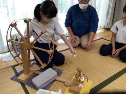 布を一からつくるため、糸紡ぎに挑戦しました。挙母木綿伝承会の方々から、糸紡ぎの仕方を丁寧に教えていただきました。自分の手で糸が紡がれていくことに感動していました。