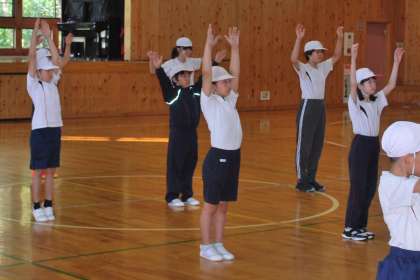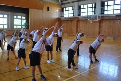 体をほぐし、体を温める準備体操はケガの予防や運動のパフォーマンス向上に効果があります。一生懸命に取り組む姿がとても格好いいです。