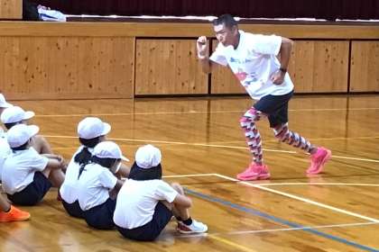 ストレッチで体をほぐした後、青戸さんが「姿勢が大切」「腰をピンと伸ばそう」「正しい姿勢で座ったり、立ったり、歩いたりすることができるようになると、地面をしっかり蹴ることができて速く走れるようになる」と走るコツを子どもたちに話していました。