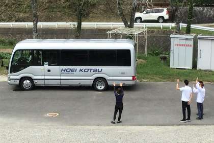 運転手さんにあいさつをしてバスに乗りました。公務手さんや留守番の先生たちがバスを見送っていました。