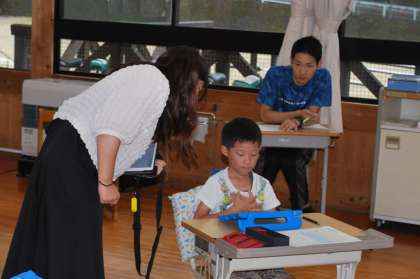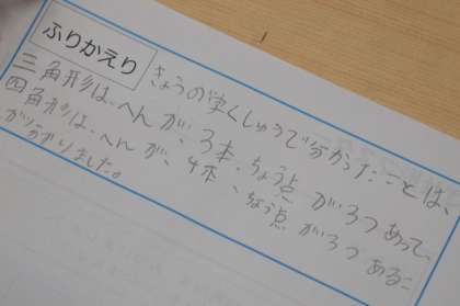授業の始めに3本の直線で囲まれた形を三角形、4本の直線で囲まれた形を四角形であることを確認しました。その後、子どもたちは辺や頂点の数から、提示された図形が三角形か四角形か、どちらでもないかを考えました。