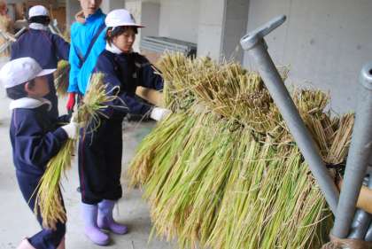 はざかけの仕方の説明を聞いた後、全校児童で作業をしました。昨年度に比べて、今年度は刈り取った稲の量が多かったので、防鳥網の数を増やして刈り取った稲の束の上に網をかけるようにします。