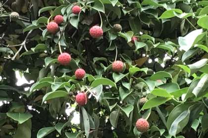校舎北側のヤマボウシの小さな実が赤く色づきました。ネットによると、ヤマボウシの実は甘く、マンゴーやバナナの味に似ているそうです。