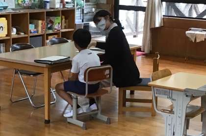 担任の先生から一人一人に励ましの言葉を添えて通知表が手渡されました。子どもたちは、前期の学校生活を振り返り、後期の目標を考えていました。