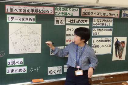2年生を対象に豊田市中央図書館の出前講座を行いました。講師の方をお招きし、図鑑を使った調べ学習の仕方を分かりやすく教えていただきました。