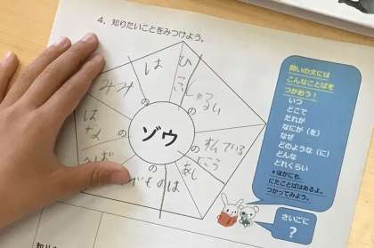 図鑑を使い、子どもたちは好きな動物などの知りたい内容がどこに書かれているか熱心に探し、プリントに書き写していました。