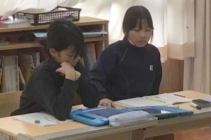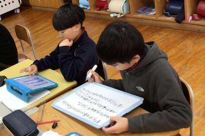 子どもたちは教科書の図や資料を活用し、分かったことや気付いたことを白ボードに書き、発表していました。
