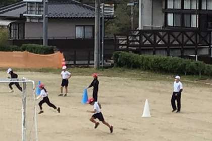 決められた距離を往復し、次に走る子にバトンをつなぎ、その回数を競いました。ペースが少しずつ上がるにつれて、どのチームからも「早く、早く」と走っている子に声をかけ、励ましていました。