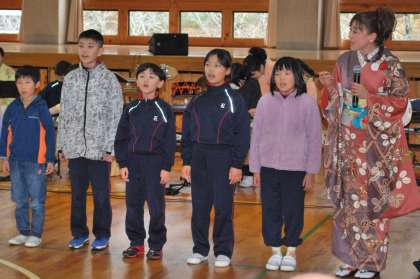 3限のワークショップで練習した「さくら さくら」の発表で、2,3年生は唄で参加しました。