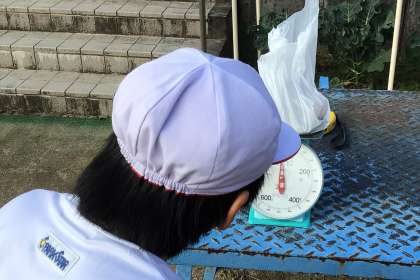 1kgの重さになるように、運動場の石などを袋に拾い集めて重さを量りました。子どもたちは拾い集めた石を、はかりに載せた後、針が指している目盛りの位置を読み取っていました。