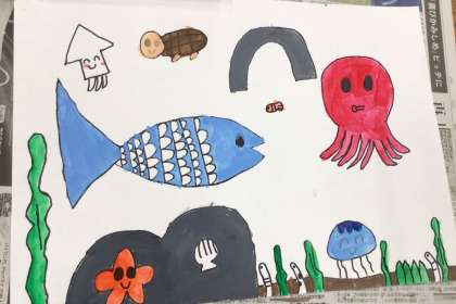 「にじいろのさかな」という物語の中からお気に入りの場面を選び、イメージを膨らませて絵を描いていました。