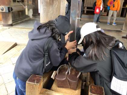 清水寺は混んでいましたが、弁慶が使ったとされる「鉄の錫杖」を4人で持ち上げようと挑戦しました。重さ96キログラム。びくともしませんでした。