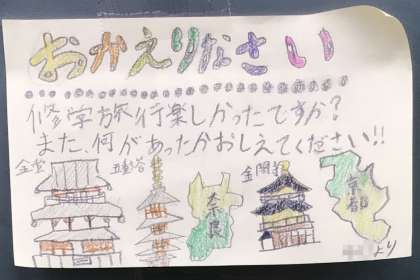 5,6年生の教室では、2〜5年生が「修学旅行おかえりなさい」の温かいメッセージとかわいいイラストをかいていました。15日(月)に登校した時には、ぜひ思い出話をたくさん聞かせてくださいね。