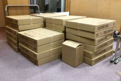 大規模地震等の災害時に学校が避難所として機能するために、自治区の防災グッズ(間仕切り付きの段ボールベッドと簡易トイレ)を運び入れました。