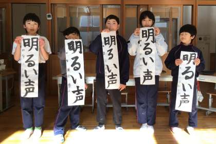 最後に、書き初め練習で書いた作品を持って記念撮影をしました。