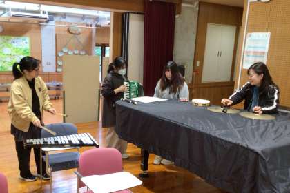 先生たちがアコーディオンやリコーダー等を準備し、ある曲の演奏練習をしていました。練習している先生に聞いたところ、冬休み明けに子どもたちの前で披露するそうです。どんな曲を演奏してくれるのか楽しみですね。