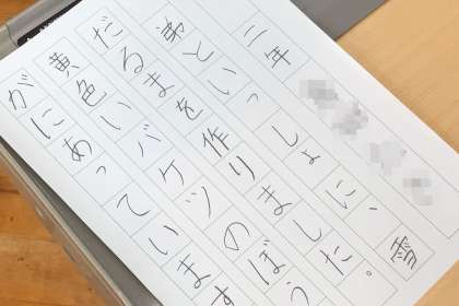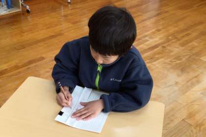 2年生はじっくりと手本を見つめながら、一画一画を丁寧に書き進めていました。
