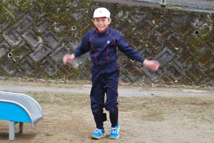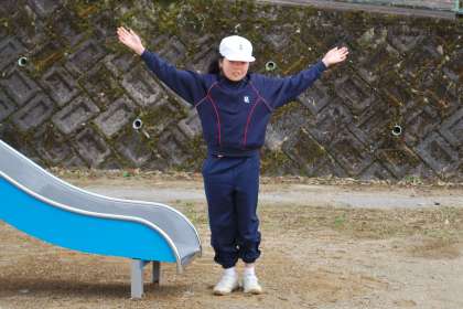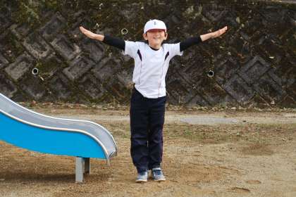 子どもたちは滑り台の上から将来の夢を声高らかに叫んだ後、滑り台を滑り降り、ポーズを決めていました。