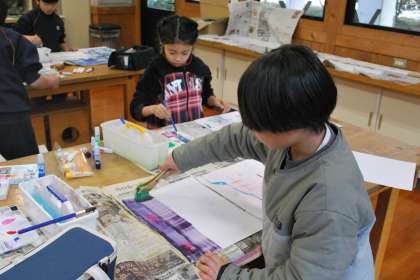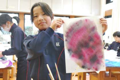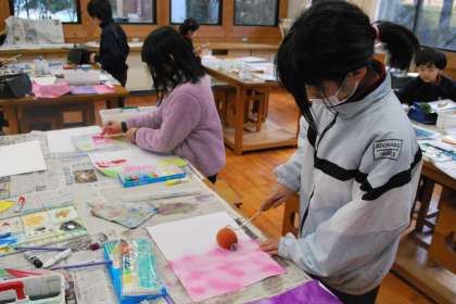 「真夜中のピエロ」を作り始めました。今日の授業は、そのための材料づくりをしました。画用紙にローラーやスポンジ、刷毛等を使って着色し、偶然現れる模様を作って楽しみました。どんなピエロの顔が完成するのか楽しみです。