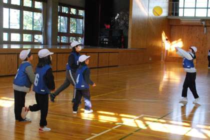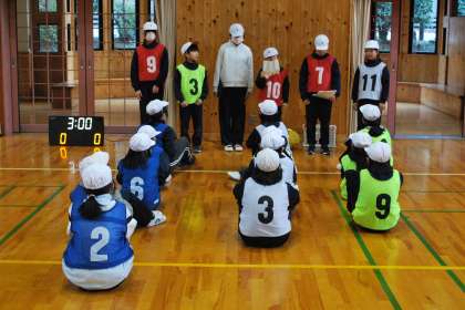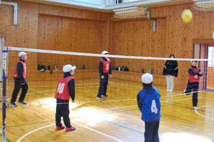 給食後の休み時間に全校遊びをしました。今回の全校遊びは、ソフトミニバレーボールでした。ルール説明の後、各チームに分かれてゲームをしました。