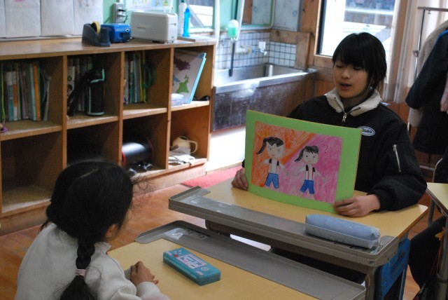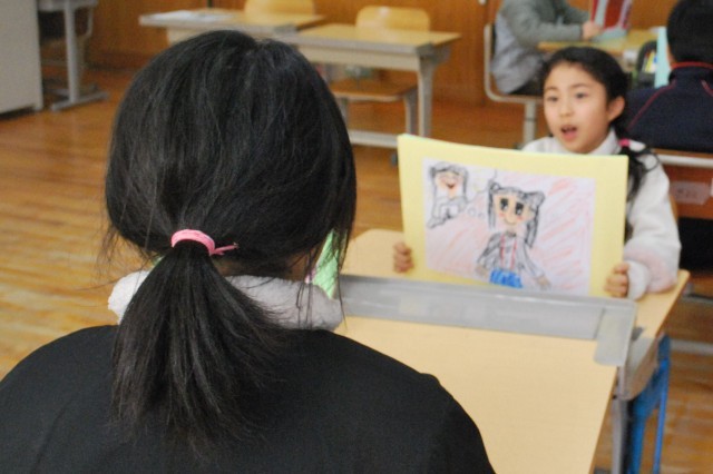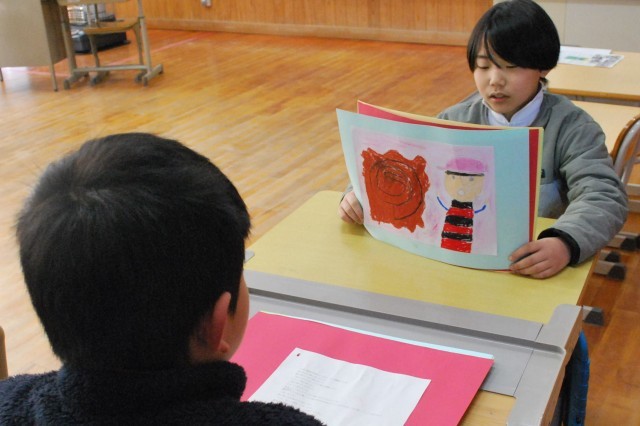 思い出を振り返る4コマ紙芝居を作りました。ペアになって、心に残った出来事を紙芝居形式で発表し合いました。友達の話の組み立ての面白さを味わっていました。