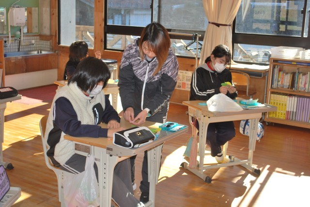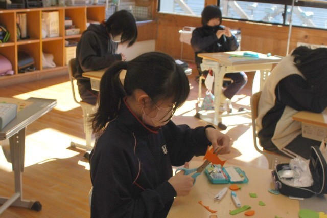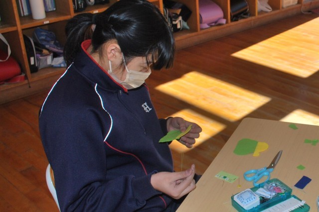 本校のマスコットキャラクター「はぎのん」のぬいぐるみを作っていました。本体のフェルトがずれないように、まち針で固定し、縫い合わせていました。完成後は卒業記念として、図書館(本の森)の図書コーナー等で活用します。