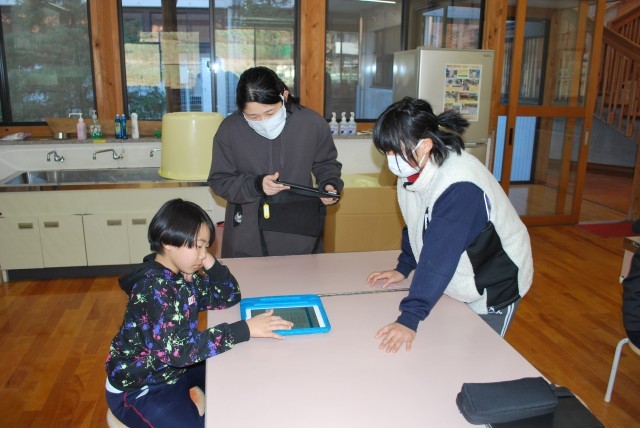 当日の発表の流れを確認した後、各グループに分かれて発表原稿の読み合わせをしました。本番では、何が起きるか分かりません。学習用タブレットを操作したり、実物を用意したりして発表するため、どんなハプニングが起きても落ち着いて発表ができるように練習を繰り返し行っていました。