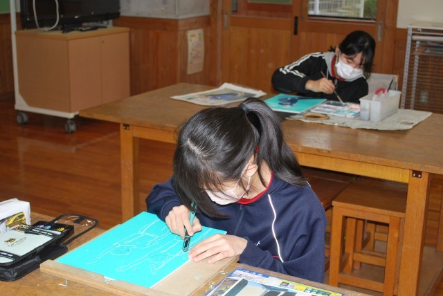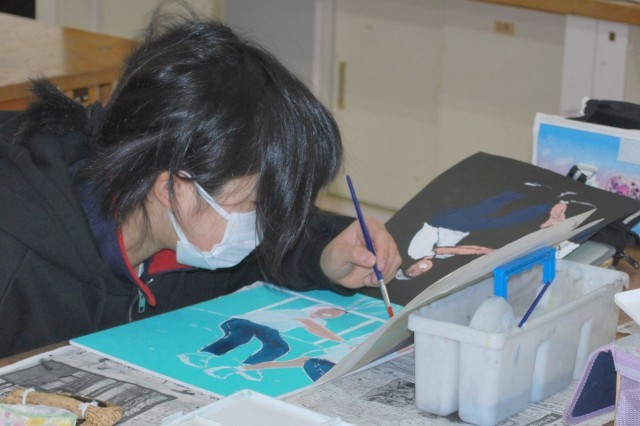 りんかくの細かい線を三角刀で線彫りした後、彫り終えた子から色付けが始まりました。少し濃い目の水彩絵の具を版に付けて紙をかぶせて刷る、また色を付けて紙をかぶせて刷る、これを根気よく繰り返して仕上げます。