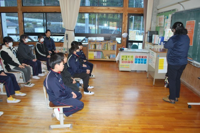 4~6年生は、きちんとした姿勢で座り、物語の世界に引き込まれている様子でした。