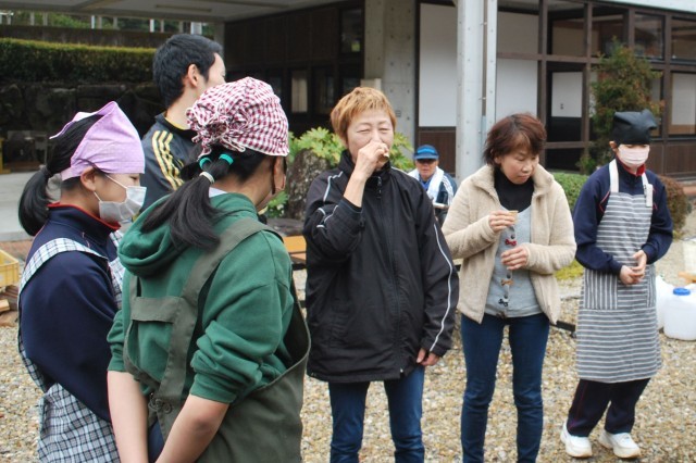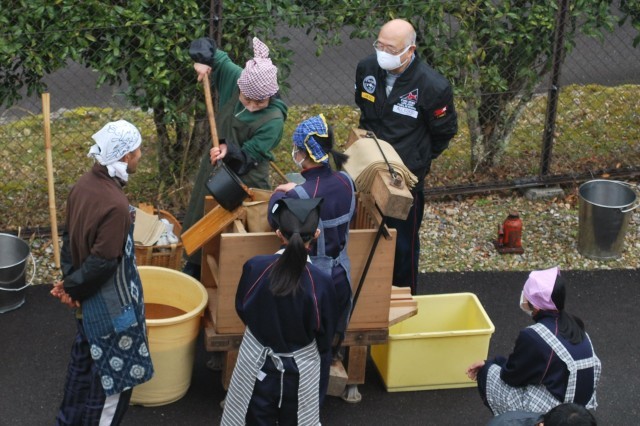 搾り出した醤油の原液をお湯で薄めて、試飲しました。公務手さんたちも仕事の合間を縫って作業の様子を見に来られ、子どもたちと一緒に試飲しました。講師の先生曰く「出来は上々」とのことでした。