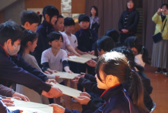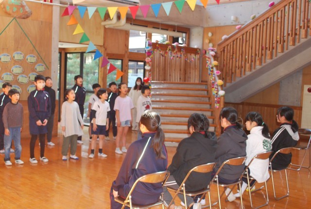 6年間を振り返るスライドショーの後、6年生に「ありがとう」の気持ちを込めて、2~5年生は合唱を披露しました。合唱のラストのところで、歌いながら6年生に近づいてプレゼントを贈り、6年生を驚かせる演出がありました。