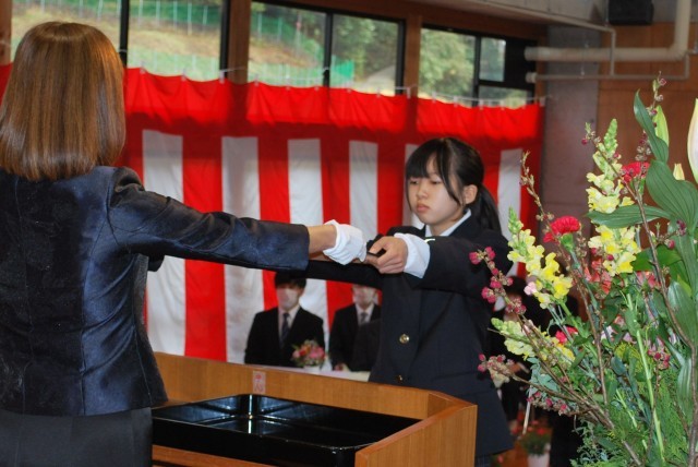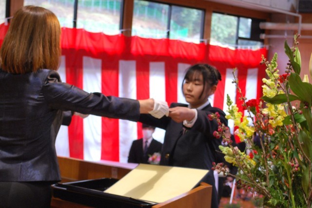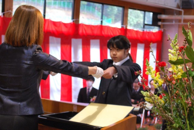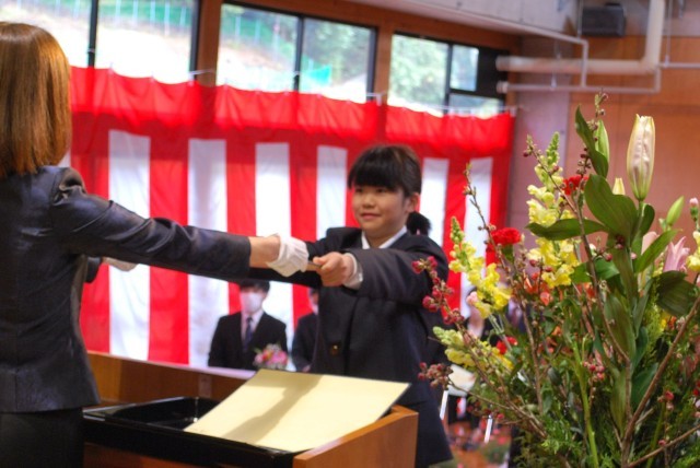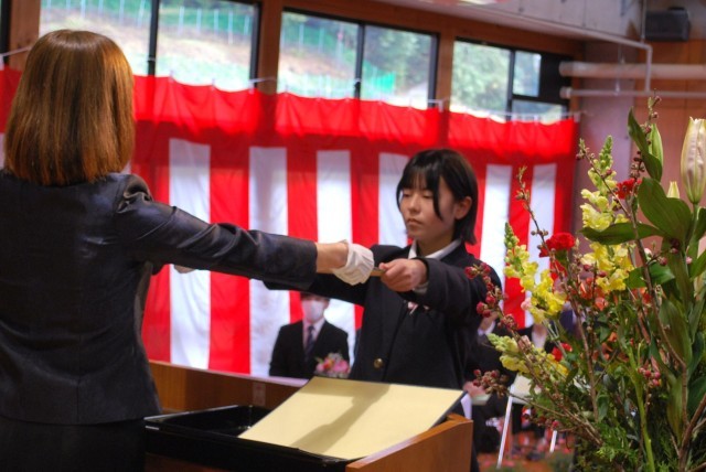 校長先生から6年生へ卒業証書が一人一人に手渡されました。担任の呼名を受けて、気持ちの良い「はい」という返事の後、壇上に上がり卒業証書を受け取りました。