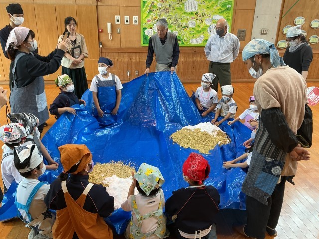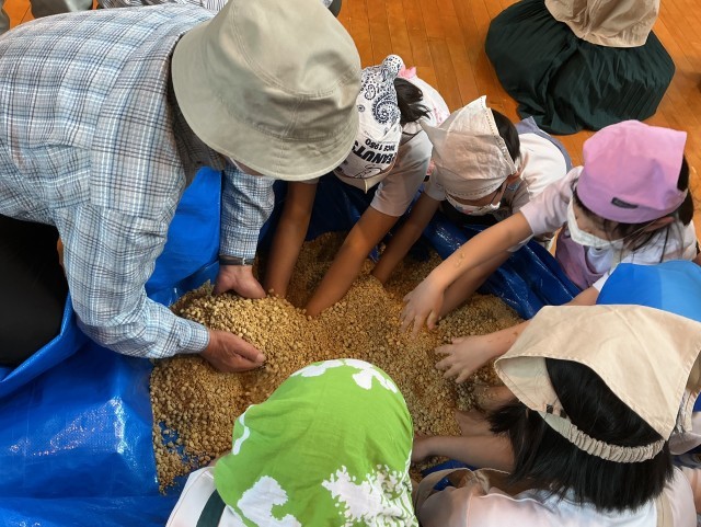 これから1年間、子どもたちは心を込めて諸味を育てます。地域コーディネーターの山本さん、西さん、ボランティアの鈴木さんもお手伝いしてくださいました。いつもありがとうございます。