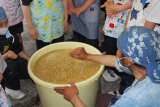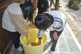 5,6年生が天地返しをしました。仕込みをした後、しばらくの間は塩が樽の下部に溜...