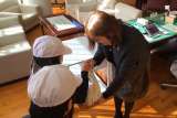 先生たちがアコーディオンやリコーダー等を準備し、ある曲の演奏練習をしていました...