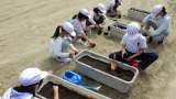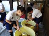 5・6年総合的な学習の時間。 しょうゆの仕込みです。容器に移し替えることで、中に...