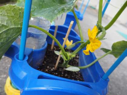 きゅうりのつるが支柱に巻きつき、花が咲きました。