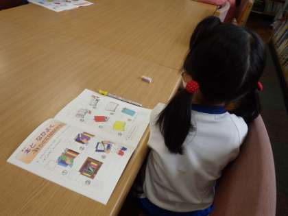 この日は、図書館司書の戸谷さんと一緒に「よみりん・かたるん どくしょノート」を使って、図書館の使い方の確認やおすすめの本クイズを行いました。子供たちは、とても楽しそうにクイズに参加していました。