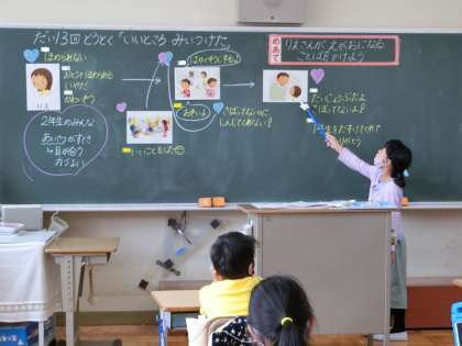 2年生の道徳科「いいところ みいつけた」の授業では、主人公のりえさんが笑顔になることばについて、真剣に話し合う様子が見られました。