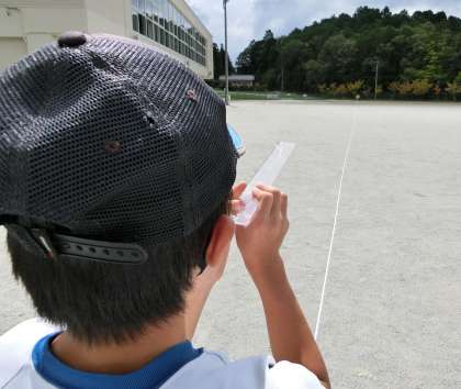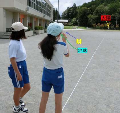 理科「月と太陽」の学習のまとめとして、自分たちが興味をもって調べたことの発表会を行いました。また、太陽の大きさが直径1mだったとしたときの、地球・月の大きさや互いの距離関係を、運動場に出て確かめました。