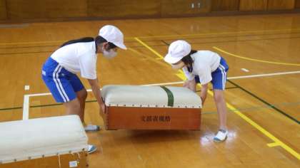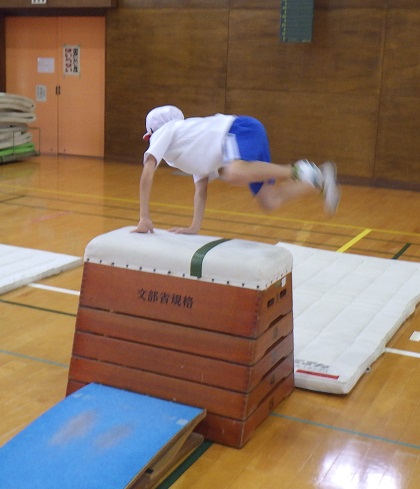 1・2年生が「とびばこあそび」を行っていました。跳び箱を開脚で跳び越したり、跳び箱についた手を軸にして回転とびをしたりしていました。準備や片付けも、グループの仲間と力を合わせてがんばりました。